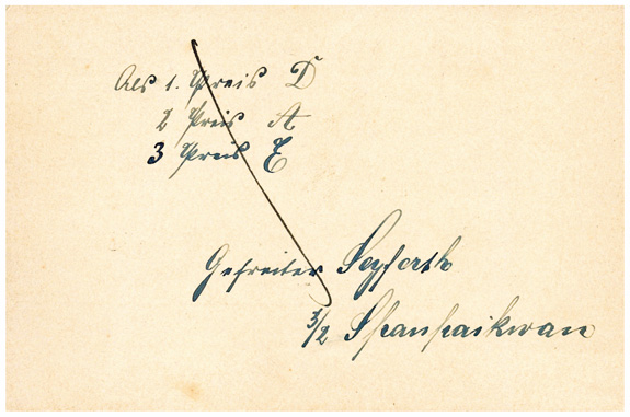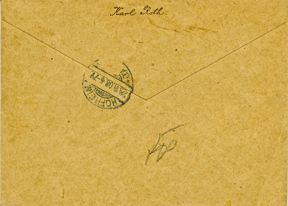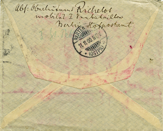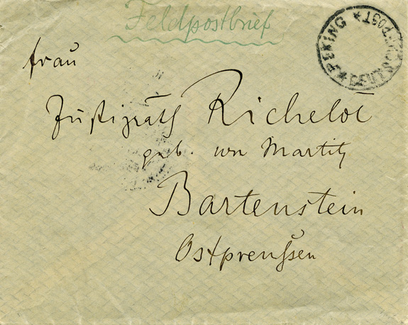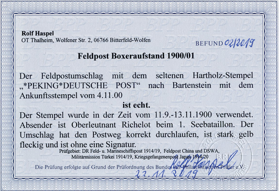 Sept./Okt. 1900: Feldpost-Brief mit Hartholz-Stempel PEKING DP (ohne Datum, ArGe 2) nach Bartenstein/Ostpr. (4.11.00). Absender ist Oberleutnant Richelot vom I.Seebataillon. Befund Rolf Haspel: ".. Der Umschlag hat den Postweg korrekt durchlaufen, ist stark gelb fleckig..". Der Hartholzstempel ist auf Bedarfsbelegen sehr selten!