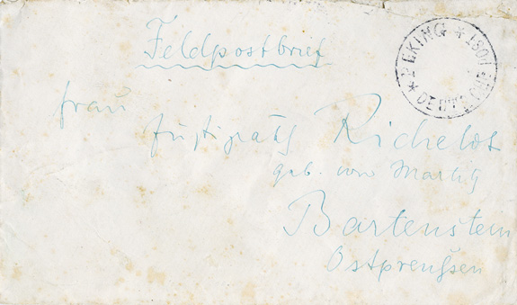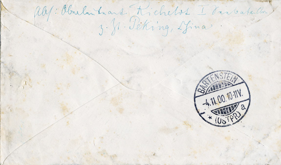 1900: Feldpostbrief mit PEKING (Weichholzstempel) nach BARTENSTEIN/Ostpreussen (11.11.00). Absender: Oberleuntant Richelot / "mobiles I Seebataillon / Berlin Hofpostamt / z.Zt.Peking".