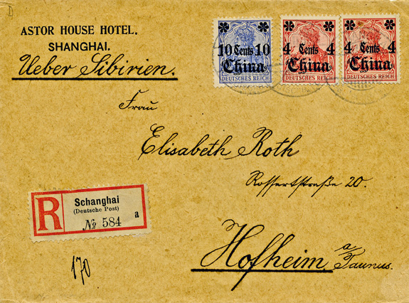 03.11.1908: 2x 4Cents & 1x 10Cents (Mi.30, 31) mit 3x Stempel SCHANGHAI auf Firmenbrief "Astor House Hotel Shanghai" mit Weiterleitungs- vermerk "Ueber Sibirien" als R-Brief an Frau "Elisabeth Roth" in HOFHEIM (23.11.08); rs Absender "Karl Roth".