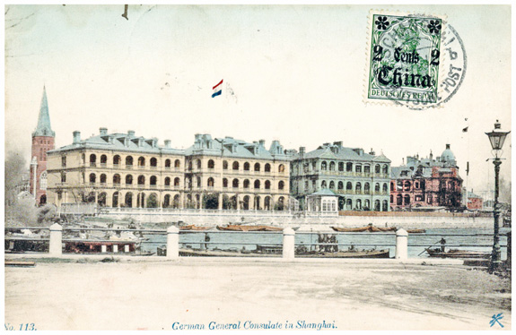 15.11.11: gebrauchte Ansichtskarte "German General Consulate in Shanghai" mit 2 Cents (Mi.39) und Stempel SCHANGHAI"b" nach Mainz.