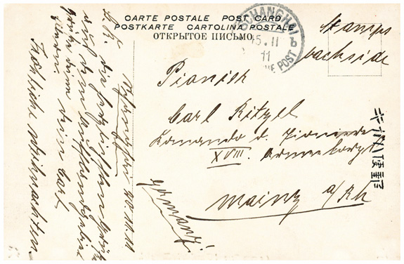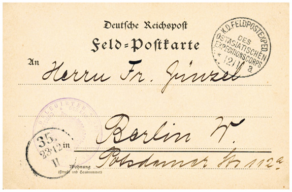 12.11.1900: Feldpostkarte mit Stempel "K.D.FELDPOSTEXPED DES OSTASIATISCHEN EXPEDITIONSCORPS '*a'" und seltenem violettem Adlerstempel "Delegirter der Freiw.Krankenpflege des Kaiserl.Kommissars und Militär-Inspekteurs".