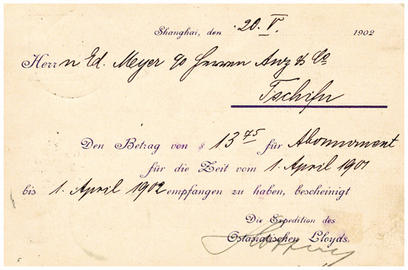 Originalbeschreibung: Inlands-Nachnahme: 5Pfg. Privatganzsache (Michel Nr. P 10 Y) als portogerechte Nachnahmepostkarte des Ostasiatischen Lloyds über 14 Dollar und 5 Cents mit 10Pfg. Zusatzfrankatur (Mi.Nr.17) und Stempel SHANGHAI DP -a- 2.6.02 sowie rotem Nachnahmezettel an Ed.Meyer bei der Firma Anz. & Co. in Tschifu mit Ankunftsstempel 5.6.02. Eine extrem seltene Portostufe mit 10Pfg. "Vorzeigegebühr" und in dieser Form einer von wenigen bekannten Belegen.