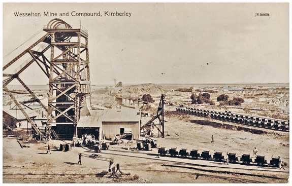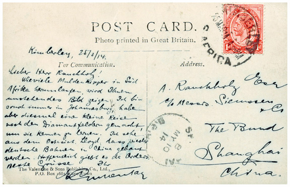 25.03.1914: Ansichtskarte "Wesselton Mine" von KIMBERLEY (Südafrika) an Herrn A.Rauchholz "c/o Messrs Siemensen Co. / The Bund / Shangai" (Ankunfsstempel 10.5.14). Textauszug:"..Ich sehe aus dem Ostasiat.Llyod, dass wieder deutsche Bahnen in China gebaut werden..".