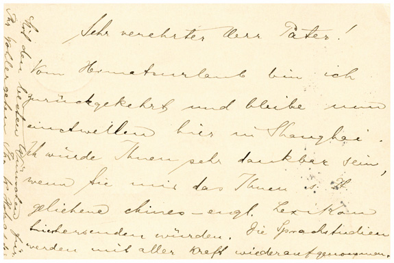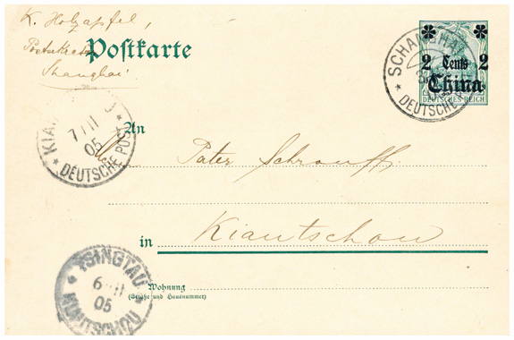 03.11.1905: 2C Ganzsachenkarte (Mi.P14) mit Stempel SCHANGHAI und Transitstempel TSINGTAU an einen Pater in KIAUTSCHOU (7.11.05) - Text betrifft "chin.-engl. Lexikon". Dazu 2C Ganzsachenkarte (Mi.P14) aus Tientsin an "die Schriftleitung der Brigadezeitung Tientsin".