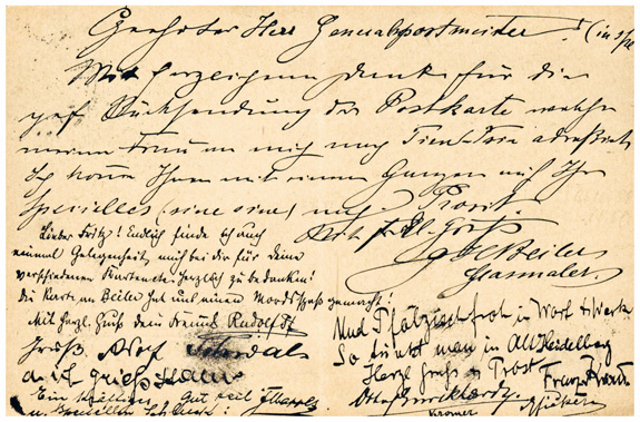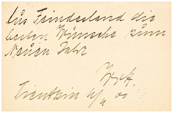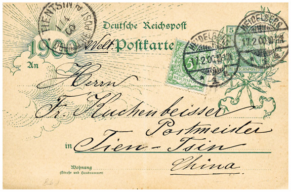 1900: 5Pf Germania Jahrhundert-Ganzsachenkarte "1900" & DR 5Pf mit 2x Stempel HEIDELBERG (17.2.00) an "Herrn Fr. Kuchenbeisser / Postmeister / Tien- Tsin / China" mit AkSt TIENTSIN"a" (1.4.00). Rückseitig Glückwünsche von Kollegen & Freunde an den "Geehrter Herr Generalpostmeister (in spe)". Mittelbug.