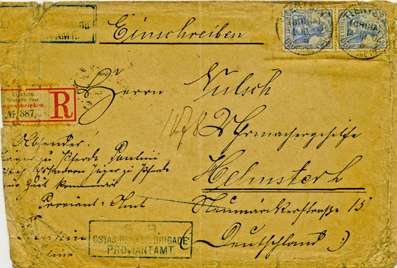 14.10.1902: 2x DR 20Pf Germania mit Stempel 2x TIENTSIN als R-Brief nach HELMSTEDT (23.11.1902) und 2x Soldatenbriefstempel OSAS.BESATZ.BRIGADE PROVIANTAMT. Im Absendervermerk vom Proviantamt Tientsin werden eintreffende Jäger zu Pferde erwähnt. Einige Gebrauchsspuren.