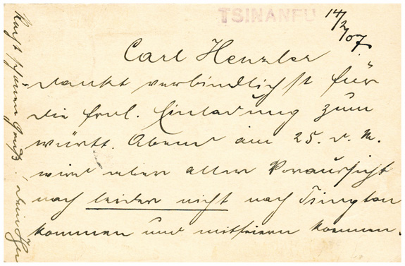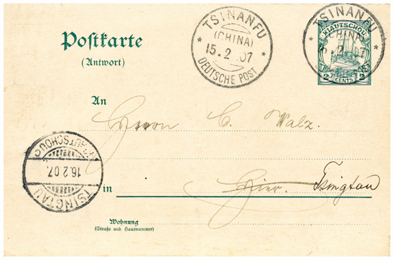 15.02.1907: 2 Cents Bedarfs-Ganzsachenkarte (Mi.P5, Antwortseite) mit 2x Stempel TSINANFU nach TSINGTAU (16.02.07); Bedarfs-Inlandspost ist selten!
