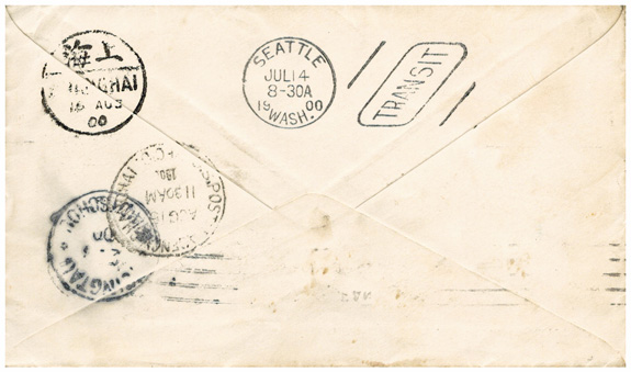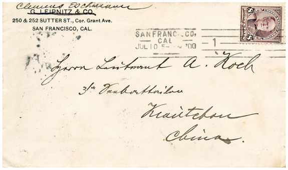 1900: 8 Cents US Postage auf Firmenbrief "G LEIPNITZ & CO.. SAN FRANCISCO" mit Maschinen-Streifen-Stempel SAN FRANCISCO (10.7.00) an "Leutnant A.Koch / 3te Seebattaillon / Kiautschou / China". Rückseite mit Transitstempeln SEATTLE (14.7.), US POSTAGE SHANGHAI (15.8.), chines. Auslandspoststempel SHANGHAI & Ankunftsstempel TSINGTAU/KIAUTSCHOU.