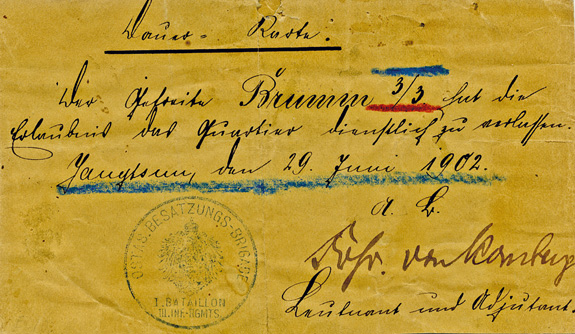 29.06.1902: "Dauer-Karte", amtlicher Nachweis zum Ausgang eines Gefreiten. In der Karte heisst es "..hat die Erlaubnis das Quartier dienstlich zu verlassen. / Yangtsun, den 29.Juni 1902" - gezeichnet vom Leutnant und Adjuntanten mit Dienstsiegel der "OSTAS.BESATZUNGS-BRIGADE / I.BATAILLION III.INF.-RGMTS".