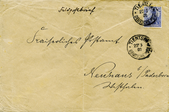 22.03.01: Petschili DR 20Pf Germania (Mi.PVd) mit Stempel TIENTSIN auf Feldpostbrief an das Postamt in Neuhaus bei Paderborn. Umschlag Mittelbug. Feldpost-Briefe bis 50gr waren Portofrei, von 50-250gr waren 20Pf fällig.