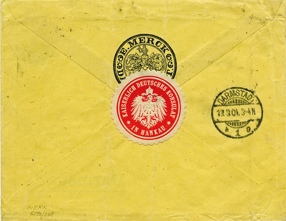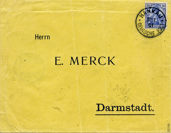 30.11.1901: 20Pf (Mi.PVd) mit Stempel HANKAU auf Privatbrief (mit Klappenaufdruck "MERCK..") an Herrn Merck in DARMSTADT (13.03.01); rückseitig rote Siegelvignette "KAISERLICH DEUTSCHES KONSULAT * HANKAU *". Doppelt geprüft Mansfeld. Brief Mittelfalte.