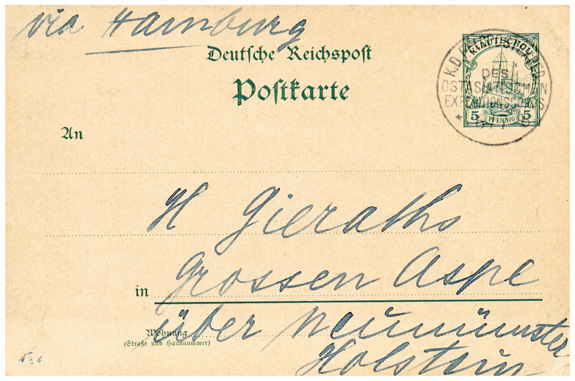 05.07.1900, Petschili: 5Pf Ganzsachenkarte (Mi.AP1) mit Stempel K.D.FELDEXPED DES OSTASIATISCHEN EXPEDITIONSCORPS "b" und Vermerk "via Hamburg" nach Gossen/Aspe. Michel -, philatische Grusskarte.