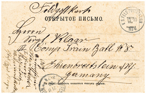 13.10.1900: russ. Feldpost-Karte mit Stempel "K.D.FELD-POSTSTAION No.4" an Herrn Sergt. Klaar bei der "III.Comp Train Batl No 8" in EHRENBREITSTEIN (21.11.00); Absender ist "Unteroffizier Steinbrecher / I.Feldhaubitz / Munitionskolonne..", der schreibt u.a. "..Helmig liegt im Lazareth, kommt nach Yokohama ins Lazareth zur Erholung..".