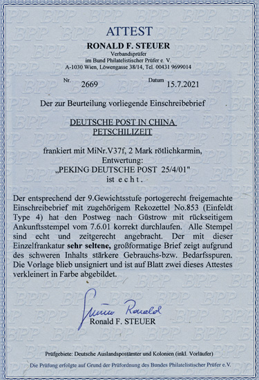 Originalbeschreibung: Einzelfrankatur 2Mk. V37f rötlichkarmin: hervorragend farbfrische Frankatur auf Feldpost-Einschreibebrief eines Angehörigen des I.Seebataillons nach Güstrow gelaufen. Klarer Stempel PEKING 25/4 01, sowie rs. Ak.-Stempel vom 7.6.1901. Eingeschriebene bzw. übergewichtige Feldpostbriefe mußten vollständig frankiert weren, wobei der hier gezeigte Brief für die 9.Gewichtsstufe freigemacht ist (1,80 Mk. Porto zzgl. 20 Pfg. Einschreibegebühr). Der Umschlag zeigt die üblichen Gebrauchs- bzw. Beförderungsspuren aufgrund seines schweren Inhaltes. Schon ein loses Exemplar der V37f mit Entwertung durch den regulären Peking-Stempel ist nahezu unauffindbar, auf einem bedarfsmäßigen Ganzstück und vor allem als Einzelfrankatur eine der großen Vorläufer-Raritäten der Deutschen Post in China, Fotoattest Steuer BPP, lt. Michel LP.