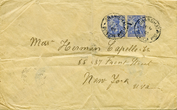 17.06.1901, Petschili: Paar 20Pf (Mi.Vd) mit 2x Stempel SHANGHAI DP"b" an "Herman Capelle & Co." in New York. Rückseitige Klappenadresse "Buchhester & Co. / Shanghai", Transitstempel YOKOHAMA (26.6.01) & Ankunftsstempel St.PONY PAID ALL (15.Juli 1901).