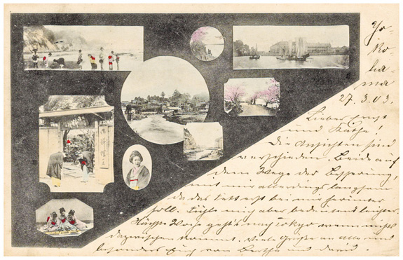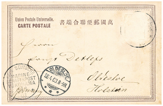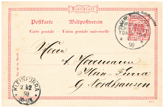 08.11.1898: 10Pf (Krone/Adler) "Nur für Marine-Schiffsposten" Ganzsachenkarte mit Stempel MSP YOKOHAMA nach KLEINFURRA, rs Blanko. Dazu jap.Ansichtskarte (Bilder-Potpourri) mit MSP YOKOHAMA & abgefallener Marke nach OLDESLOE (26.4.03).