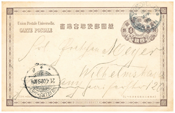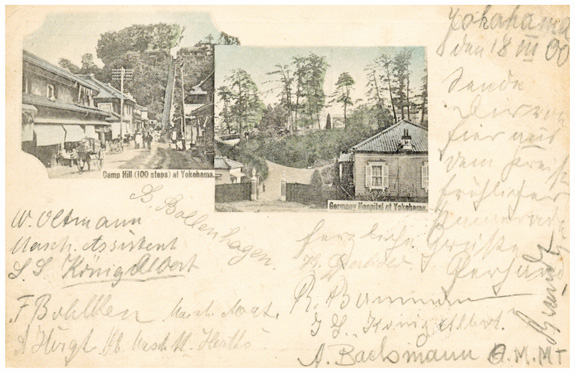 18.03.00: Japan 4Sn GSK von Yokohama n.Wilhelmshaven (21.4.00); Abbildung rs "Germany Hospital at Yokohama", Absender von SMS "Hertha" & SS "König Albert".