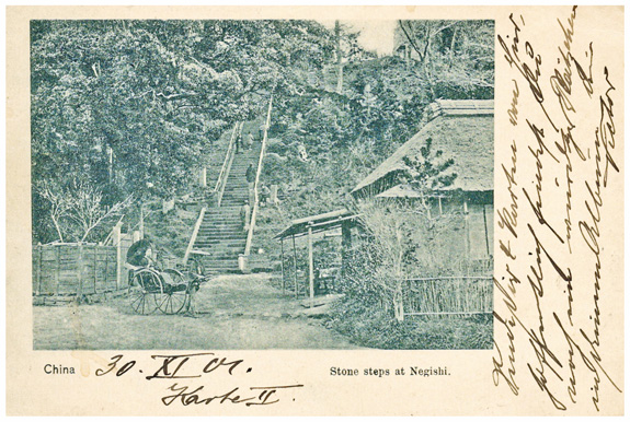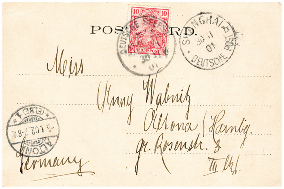 30.11.01: DR 10Pf mit Seepoststempel der Ostas.HL auf AK "China.. Negishi" mit seltenem Übernahmestempel der DP SHANGHAI (30.11.01) nach Altona (5.1.02).