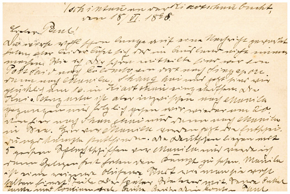 18.06.1898: DPC 10Pf GSK (Mi.VP2) mit Stempel TSINTAU CHINA"**" (ArGe 3) mit langer Routenbeschreibung der Ausreise, nach Saarburg (1.8.98).