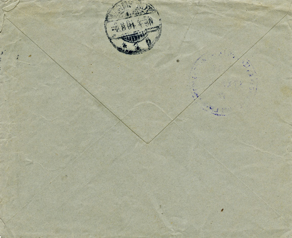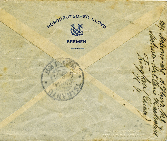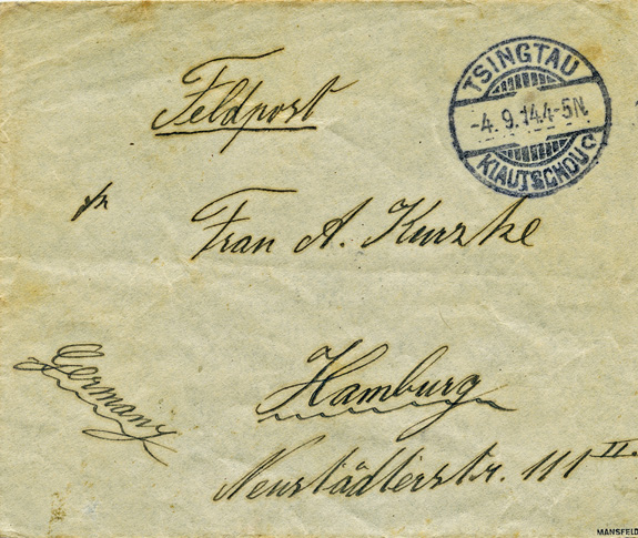 04.09.1914, Blockadepost: klarer Stempel TSINGTAU "c" (mit Stundenangabe, ArGe 11b) auf Feldpostbrief nach Hamburg; rückseitig chinesischer Auslandspostamtsstempel TSINANFU (6.9.1914) & Klappeninschrift "Norddeutsche Lloyd Bremen". Absender von der "Matrosen-Artillerie Kiautschou..". Seltener Laufweg - Brief links leicht verkürzt, signiert Mansfeld.