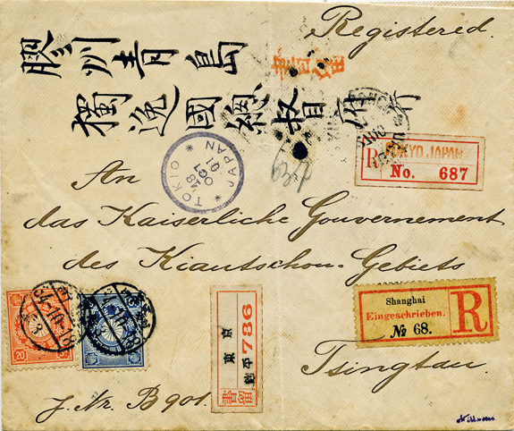 18.10.1901, Incoming Mail aus Japan/Tokio: dekorativer R-Brief der "Deutschen Gesandtschaft in Tokio" (rückseitig auf blauer Siegelvignette) an "das Kaiserliche Gouvernement des Kiautschou-Gebiets / Tsingtau". Aufgegeben im japanischen Inland als Brief der 2.Gewichtsstufe mit 10 Sen & 20 Sen (Mi.82,84) und Stempel TOKIO KOJIMACHI 34-10-18 sowie japan. R-Zettel No.736, gelangte es an das Auslandspostamt in Tokio, wo erneut ein R-Zettel - "Tokyo Japan No.678" sowie der Auslandspostamtsstempel TOKIO JAPAN angebracht wurden. Auf dem chinesischen Festland angekommen, durchlief es das deutsche Postamt in Schanghai, wo es den R-Zettel "Shanghai" (Type 3) erhielt und endete am 27.10.1901 in TSINGTAU KIAUTSCHOU. In dieser Form ein einmaliger Beleg mit 2 verschiedenen japanischen R-Zetteln sowie R-Zettel Schanghai der Deutschen Post mit Destination Kiautschou. Sehr selten, signiert Willmann.