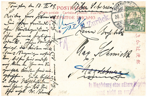 20.03.1909: 2Cents (Mi.30) mit Stempel TSINGTAU"c" auf japanischer Bedarfs-Ansichtskarte (3 Geisha) nach Magdeburg; dort mit L2 "In Magdebug ohne nähere Bezeich- /nung nicht zu ermitteln" & "Zurück" wieder retour.