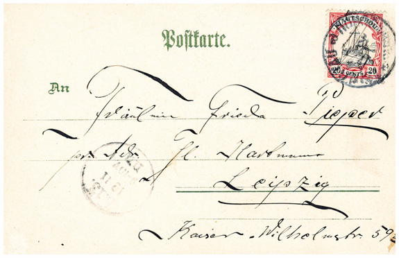 31.12.1905: 5 Cents Ganzsachenkarte (Mi.P1) mit Stempel TSINGTAU "*a" nach LIEBERTWOLKWITZ bei Leipzig (9.2.06): rückseitig Blanko.