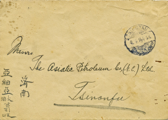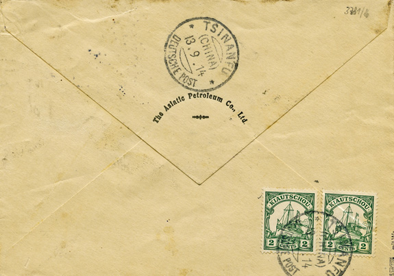 08.09.1914, Blockadepost: Stempel TSINGTAU KIAUTSCHOU "c" auf Firmenbrief der "Asiatic Petroleum Co. Ltd." nach Tsinanfu. Rückseitig, 2x 2Cents (Mi.29) mit Stempel TSINANFU (CHINA) (13.9.14) nachträglch entwertet! Doppelt geprüft Mansfeld BPP. Diese Rarität ist bisher der einzig bekannte Kriegspostbeleg aus Kiautschou mit frankieter Nachentwertung in China und im Knieper Handbuch Seite 102 abgebildet. Brief mit semkrechtem Bug.