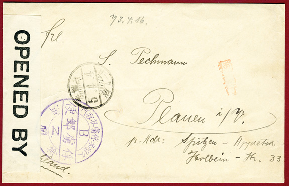 04.04.16, Kurume: Brief mit violettem Lagerstempel "B", Postleitstempel "Doitsu-yuki" (=Deutschland) und Ortsstempel nach Plauen, Zensurstreifen "OPEND BY CENSOR. 1434"; oben beschnitten.