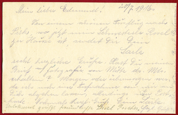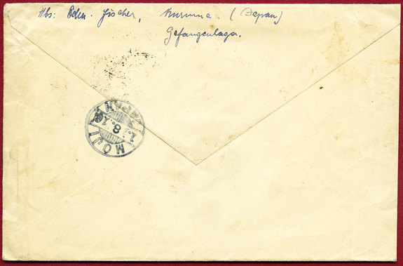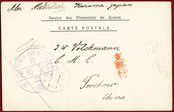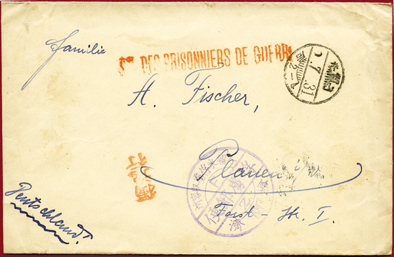 31.07.16, Kurume: Brief von Seesoldat Edmund Fischer (4.K III.S.B.) nach Plauen, oranger Stempel "Service des prisonniers de guerre" (SdPdG-Stempel Type I), violetter Lagerstempel "F" , der die Zensur einschließt und Postleitstempel "Doitsu-yuki" in Orange, rückseitig klarer Auslandsstempel MOJI(1.8.16).
