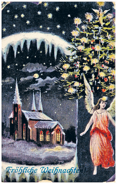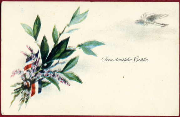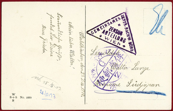 29.12.16, Kurume: farbige Bildkarte der "treuen Frieda" (Lorbeerzweige) im Umschlag ins Lager an Walter Lange, ehemals 4.K.III.S.B., violetter Lagerstempel "G" und Zensurstempel von Wien.