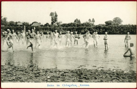 ca.1917, Kurume: ungebrauchte Ansichtskarte mit gefangenen Deutschen Soldaten beim Baden im Chikugofluss, Kurume.
