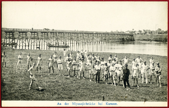 ca.1917, Kurume: ungebrauchte Ansichtskarte mit gefangenen Deutschen Soldaten beim Sport an der Miyanojinbrücke bei Kurume.