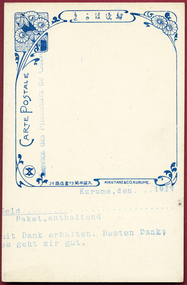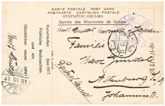 04.11.16, Kurume: Wohlfahrts-Postkarte als Kriegsgefangenensendung aus WALDKIRCHEN ins Lager, violetter Lagerstempel " G", handschriftlicher Eingangsvermerk "erh. 27.3.17" - 4 1/2 Monate nach Absendung, sehr spät für Weihnachtsgrüße!