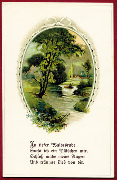 05.05.17, Kurume: farbige Bildkarte der "treuen Frieda" (Bächlein im Wald) im Umschlag ins Lager an Walter Lange, ehemals 4.K.III.S.B., violetter Lagerstempel "A".