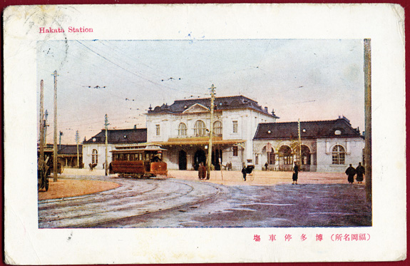 28.05.17, Kurume: farbige japanische Ansichtkarte " Hakata Station" nach Altenburg, SDPdG-Stempel Typ IV von Seesoldat Kurt Müller (3.K III.S.B.) mit violettem Lagerstempel "B" , der die Zensur einschließt, Auslandsstempel MOJI (29.5.17), violetter Leitstempel und Grußzudruck "Herzliche Pfingstgrüße!.." (Typ a).