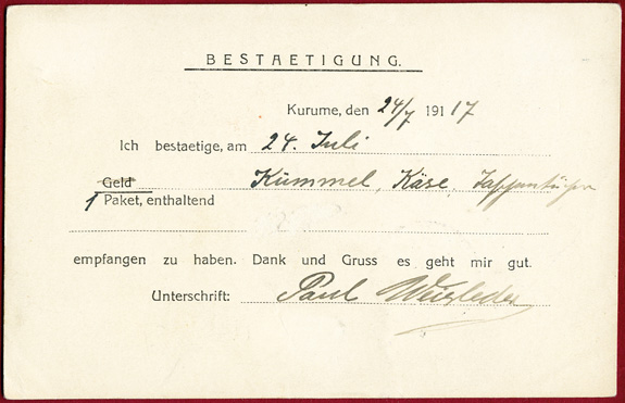 25.07.17, Kurume: Vordruck-Empfangsbestätigungskarte über ein Paket nach Foochow in China, SdPdG-Eindruck, geschrieben von Obermatrose Art. Paul Weisleder aus Weimar (ehemals 1.K M.A.K.) mit violettem Lagerstempel "B" , orangenem Postleitstempel für China und Inlandspoststempel von KURUME.