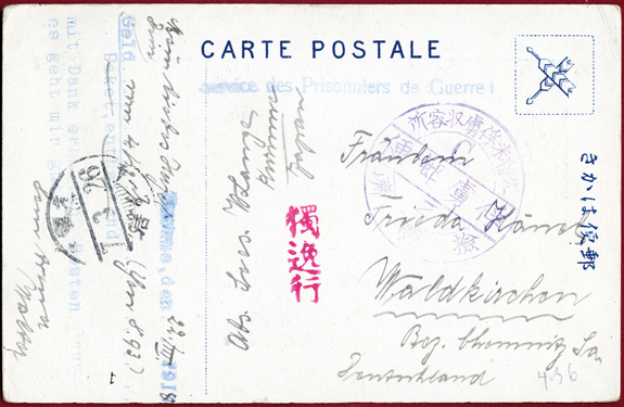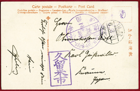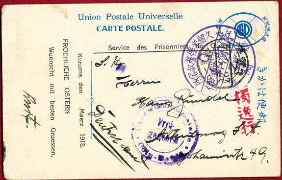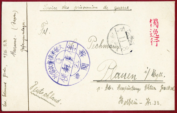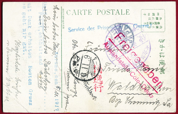 08.11.18, Kurume: Kriegsgefangenenkarte mit violettem Lagerstempel "G" (Typ II), Inlandsstempel KURUME und rotem Postleitstempel "Doitso-yuki" (=Deutschland) nach Plauen; rückseitig handschriftliche Vorausentwertung Typ II in violeter Farbe und Han von Masaki (kleinere Form).