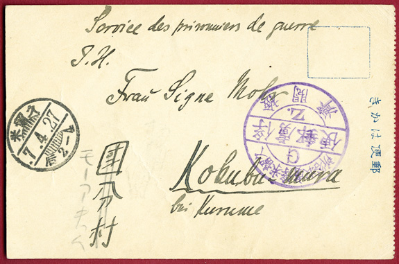 27.03.18, Kurume: farbige japanische Ansichtkarte mit Gemälde des Futschijama nach Altenburg, SDPdG-Eindruck, geschrieben von Seesoldat Kurt Müller (3.K III.S.B.) mit violettem Lagerstempel "G" (Typ II), rotem Postleitstempel für Deutschland, violettem Kreis-Zensurstempel "Frei-gegeben /CÖLN-DEUTZ" und Grußzudruck "Fröhliche Ostern.." (Typ d).