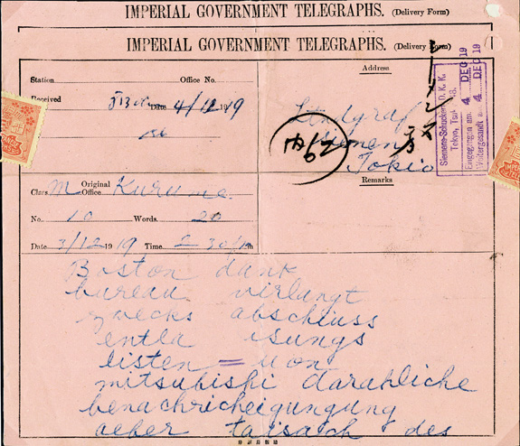 03.12.19, Kurume: Zweiseitiges Telegramm Typ II des Gefreiten Franz Semmelhack, Gef.-Nr. 3659 an das Büro Siemens-Schuckert, z.H. Herrn Landgraf in Tokyo betreffs Vertrag mit Mitsubishi, wo er nach der Entlassung 12/1919 eine Stelle angetreten hat.