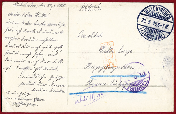 22.05.15, (Tempellager) Kurume: patriotische Karte aus WALDKIRCHEN (ZSCHOPAUTAL) als "Feldpost" an Seesoldat Walter Lange (bei der 4.K.III.S.B.) aus der Zeit ohne Lagerstempel, mit Durchgangsstemel TSURUGA (18.6.15) und Einzelstempel für Zensur.