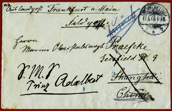 17.05.15: Feldpostbrief aus NEUSTRELITZ an Oberstabsarzt Praefcke, rückseitig klarer Ankunftsstempel SCHANGHAI (14.8.15) und "abgereist", vorderseitig Leitvermerk "via Auslandpost Frankfurt a. Main" . Praefcke, als einer der Verteidiger von Tsingtau, gelangte zunächst in japanische Kriegsgefangenschaft. Gemäß Genfer Konvention durfte er aber als Arzt nicht festgehalten werden, weshalb er zwischen dem 24.-29.Nov. wieder nach China entlassen wurde und nach Shanghai reiste. Der Brief seiner Frau sollte ihn dort erreichen, wurde aber zurückgeschickt. Der Vermerk "S.M.S. Prinz Adalbert" deutet darauf hin, dass er dort seinen Dienst antreten sollte - bei der Versenkung der "Adalbert" durch die Briten am 23.10.15 vor Libau in der Ostsee, war er aber nicht an Bord.