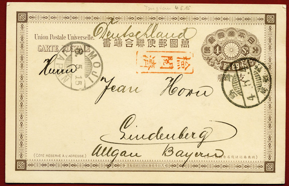 04.05.15: Japanische Ganzsache, geschrieben von einem der wenigen nach der Kapitulation in Tsingtau verbliebenen deutschen Zivilisten über MOJI (8.5.15) nach Lindenberg. Im Text steht: "Tsintau, 4. Mai 1915 Lieber Jean, Ich erhielt neulich deine Karte vom 12.III..geht es mir hier gut. Mit Josef Siebold bin ich natürlich in ständigem schriflichen Verkehr..Alle in Marugame und alle ..schreiben. Ich hatte für ihn manches zu besorgen..".