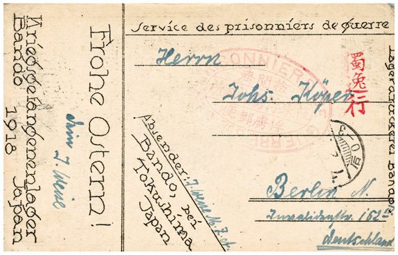 02.02.1918, Kriegsgefangnenlager Bando: Bildpostkarte 29c "Zwei Ovale, links mit einem Mädchen , rechts mit einem Gefangenen" (Serie zu Ostern, siehe Seitz S.112) aus der Lagerdruckerei Bando, mit Poststempel Bando, Lagerstempel Type 1, SdPdG Stempel Type III & Postleitstempel Doitsu-yuki. Absender ist "J.Weise". Karte etwas eckrund, aber selten!