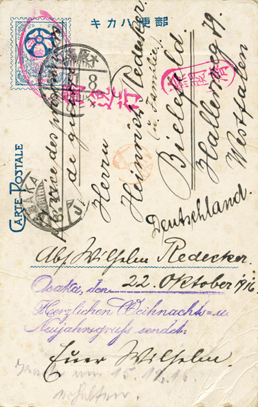 08.11.16, Osaka: Kgf-Ansichtskarte mit Aufdruck "Herzlichen Weihnachts- u.Neujahrsgruß.." und mit Stempel Osaka-Hori, Lagerstempel, TrSt Osaka (8.11.16), Leitstempel Doitsu und Kenetsuzumi von Otto Weinholz über das MPB Berlin an SMS "König".