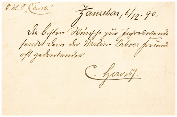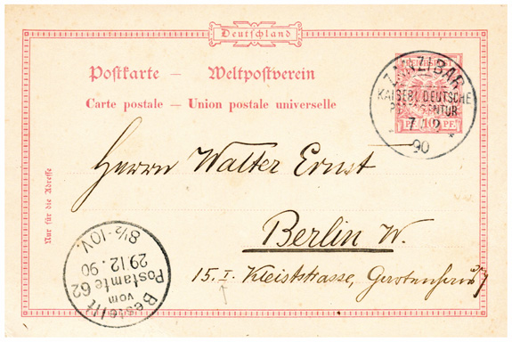 07.12.1890: 10Pf Vorläufer-Ganzsachenkarte (Mi.VP21) mit klarem Stempel ZANZIBAR KAISERL.DEUTSCHE POSTAGENTUR nach BERLIN (29.12.90); rückseitig Absenderangabe "S.M.S. Carola"; die Korvette war am Araberaufstand beteiligt und unter anderem an der Überführung des Sultans von Witu beteiligt.
