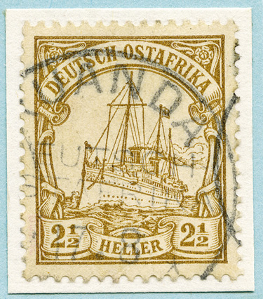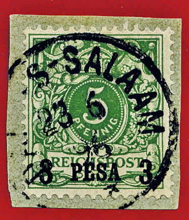 23.06.1896: 3Pesa auf 5Pf (Mi.1) mit Stempel DAR-ES-SALAAM (ArGe 3) auf Briefstück.