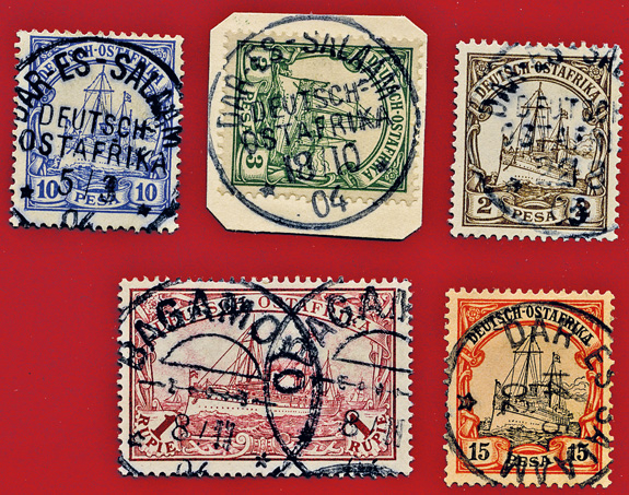 1901: kleines Lot von vier gebrauchten Marken und ein Briefstück mit Werten 2Pesa, 3Pesa, 10Pesa, 15Pesa & 1Rupie (Mi.11,12,14,15, 19) Stempel DAR-ES-SALAAM (4x) & 1x BAGAMOYO (08.17.06).