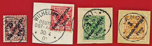 1901: kleines Lot von drei gebrauchten Briefstücken und einer Marke mit Werten 2Pesa bis 5Pesa und 25Pesa (Mi.6,7,8 &10), darunter sauberer Stempelabschlag WILHELMSTHAL (30.4.01).