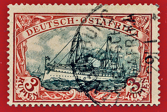 1901: Einzelmarke 3 Rupien (Mi.21b, dunkelrot/grünschwarz) mit Teilabschlag LANGENBURG (Michel 230,- Euro).